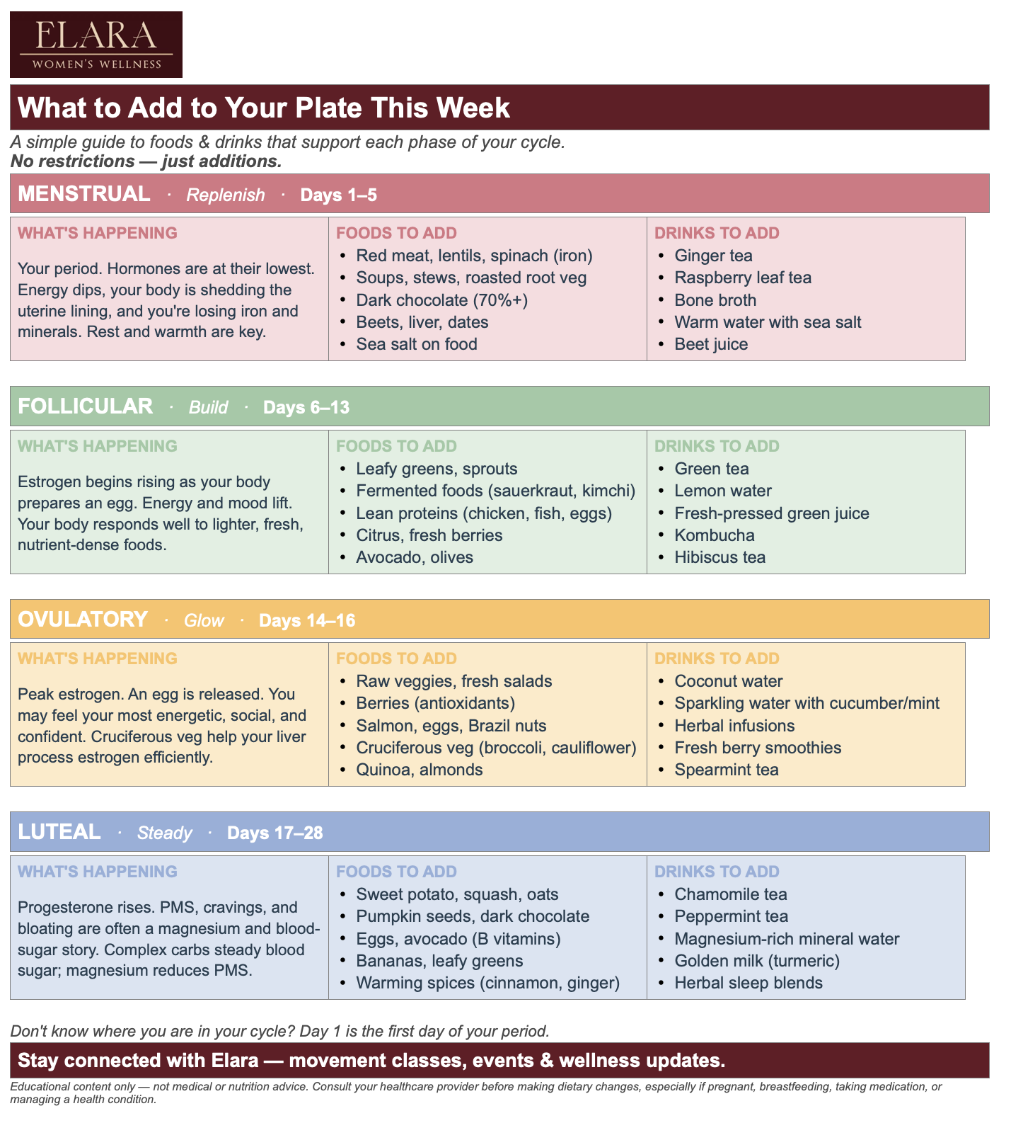 The information provided in this guide and by Elara Women's Wellness is for general educational and informational purposes only. It is not intended as, and should not be construed as, medical advice, nutrition counseling, diagnosis, or treatment.